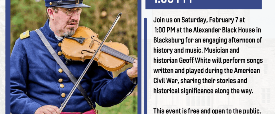 Join us for an engaging afternoon of history and music. Musician and historian Geoff White will perform songs written and played during the American Civil War, sharing their stories and historical significance along the way.