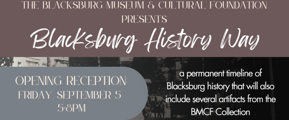 During September’s Art Walk, we will celebrate our new permanent exhibit showcasing significant events in Blacksburg. Thanks to our in-house graphic designer, Jolie Rice, for all her talent, patience, and dedication to this meaningful project.